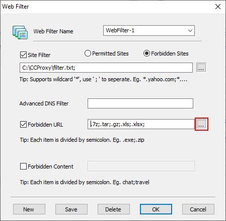 In new version of CCProxy build 20180709 and above, we have added function to select a text file for the "Forbidden URL". This comes in handy, if you have many extensions you want to filter/block.
